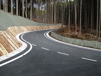 この工事は、森林整備の促進と木材の安全輸送の確保及び交通の利便向上のため、現道を拡幅し、路床をセメント改良してアスファルト舗装する工事で、法面に使用する丸太は、県産の間伐材を活用しています。